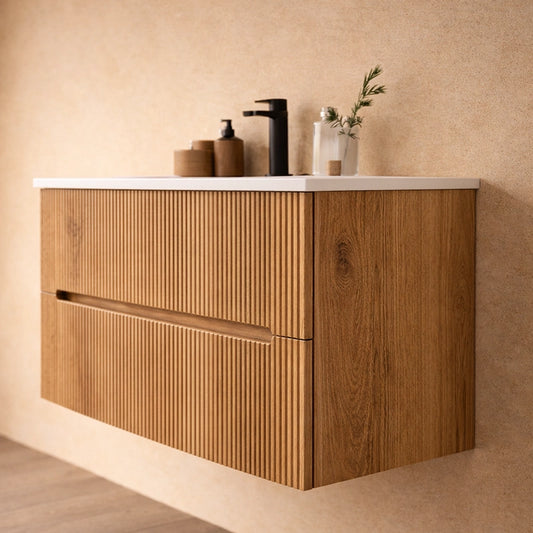 Mobile bagno rovere 90x46 cannettato Urbino due cassetti con lavabo in ceramica