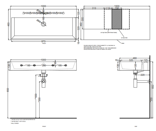 Cielo Smile lavabo 100x46 monoforo rettangolare sospeso o da appoggio con troppo pieno in ceramica lavagna