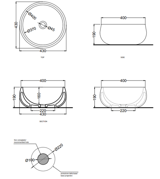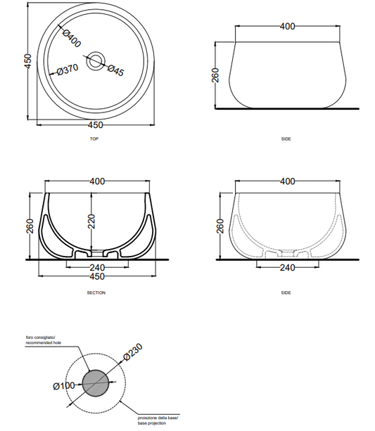 Cielo Tina bacinella 45 cm lavabo da appoggio senza troppopieno in ceramica bianco lucido
