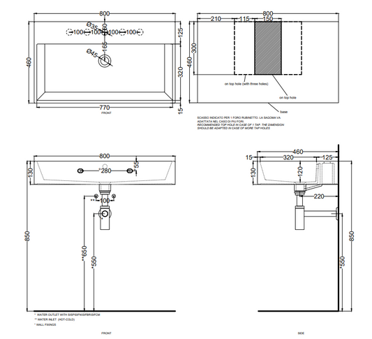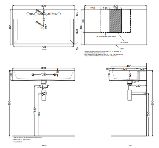 Cielo Smile lavabo 80x46 monoforo rettangolare sospeso o da appoggio con troppo pieno in ceramica lavagna