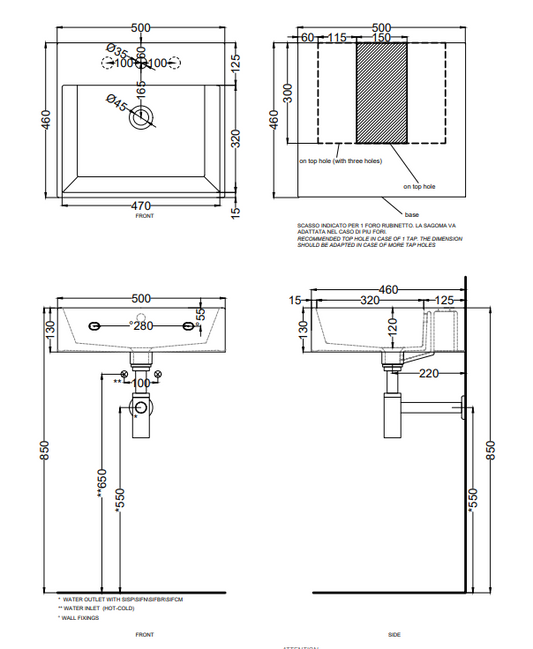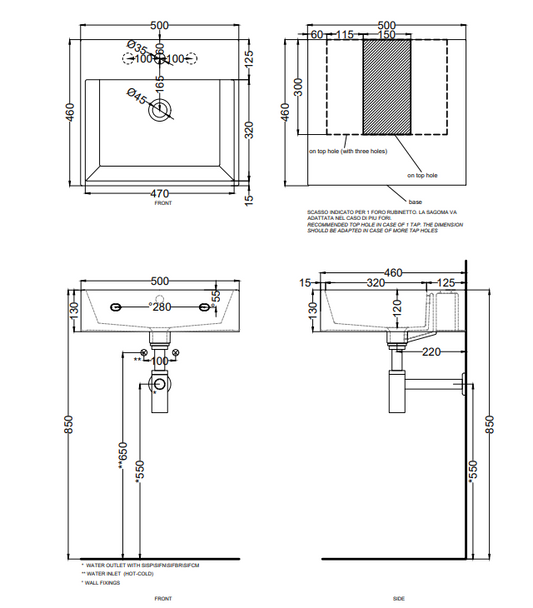 Cielo Smile lavabo 50x46 monoforo rettangolare sospeso o da appoggio con troppo pieno in ceramica lavagna