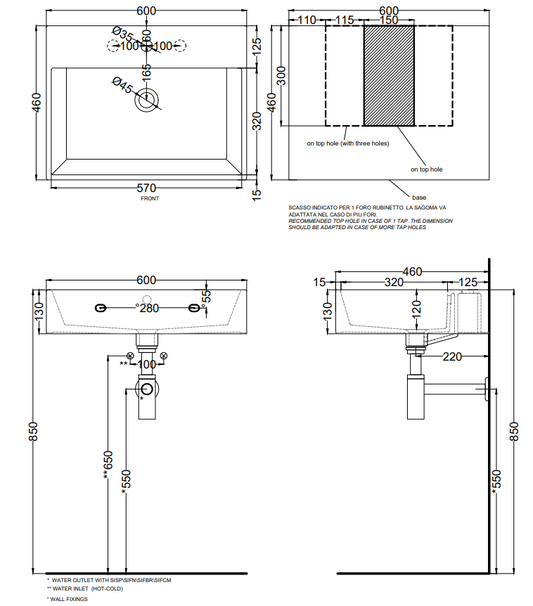 Cielo Smile lavabo 60x46 monoforo rettangolare sospeso o da appoggio con troppo pieno in ceramica talco