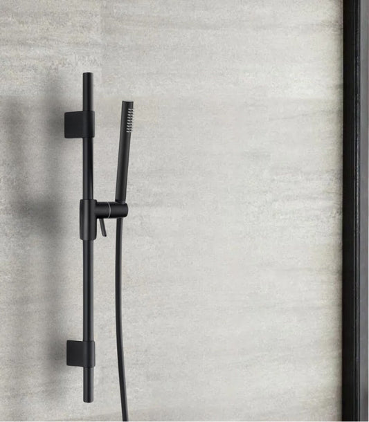 Asta doccia con saliscendi doccetta quadra in ottone e flessibile in pvc nero opaco