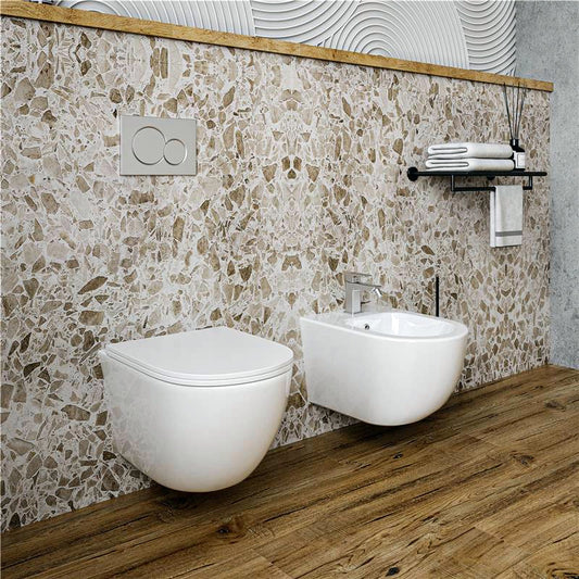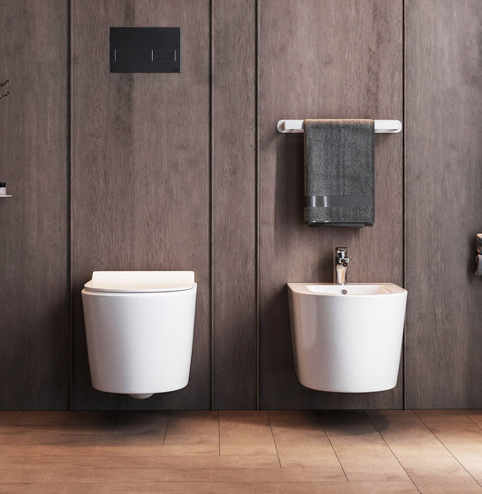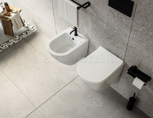 Coppia sanitari sospesi bidet e vaso rimless in ceramica con sedile soft close bianco lucido Linea Esse