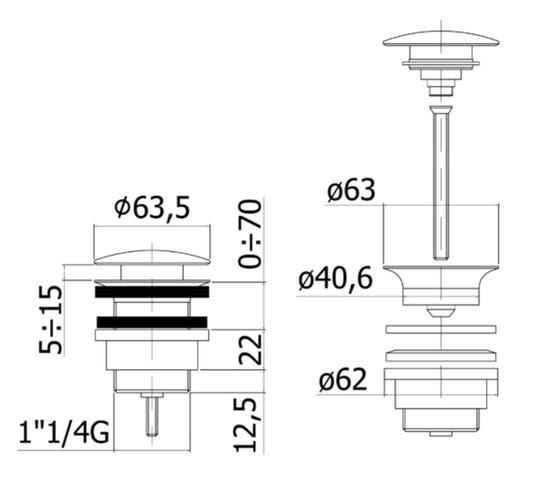 Piletta click clak per lavabo e bidet con troppopieno in pvc e acciaio nero opaco