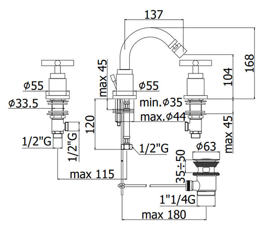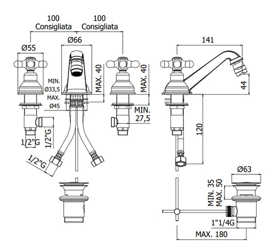 Paffoni Iris IRV118 Batteria bidet 3 fori con bocca erogazione fissa e scarico automatico cromo