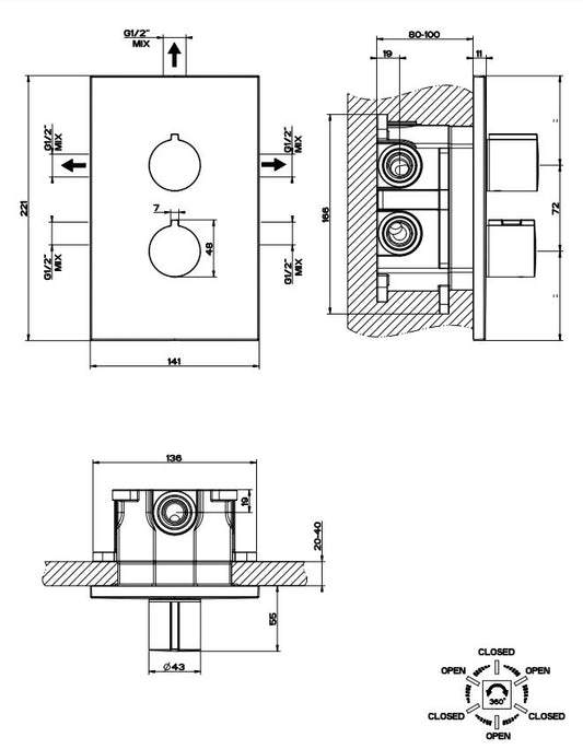 Parte Esterna Miscelatore Termostatico Alta Portata A Parete 2 Uscite Indipendenti senza parte incasso Cromo Gessi Oxygene 43234