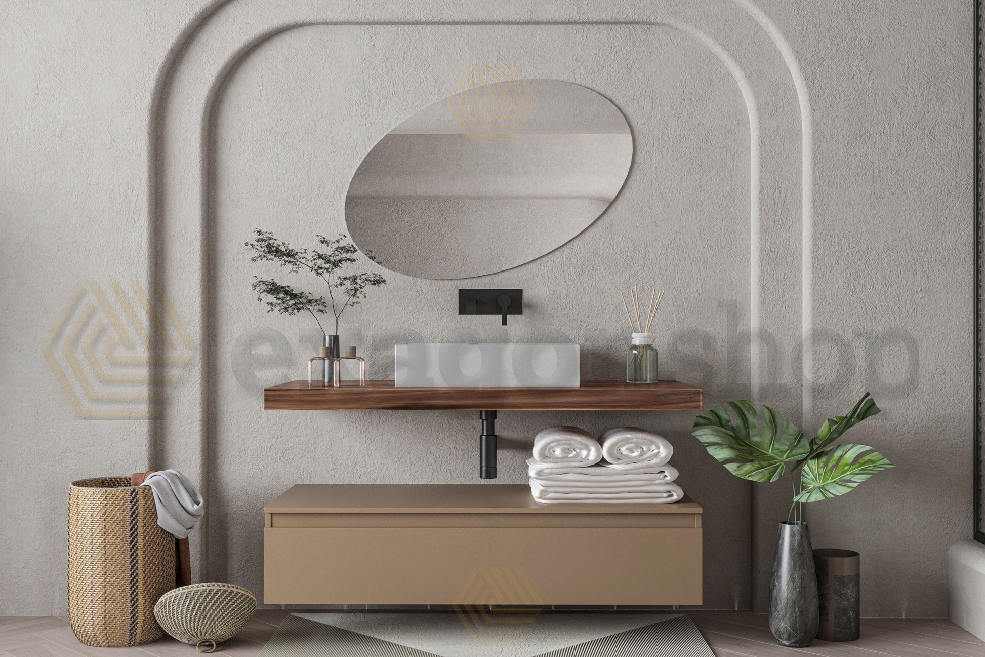 Oasy è una composizione per arredo bagno 120x50 cm che unisce eleganza e funzionalità in modo armonioso. Il top in finitura legno color tabacco con lavabo rettangolare da appoggio bianco lucido è abbinato ad un mobile sospeso color tortora opaco di cm 120x50 con un ampio cassetto dotato di maniglia a gola.