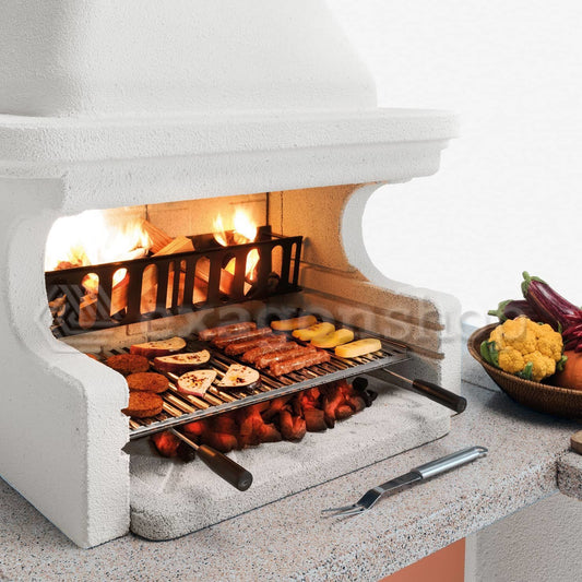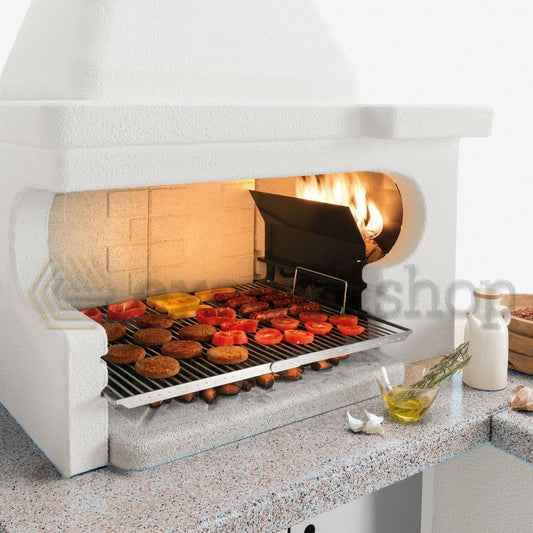 Palazzetti Patmos barbecue a legna con due aree grill e piano in marmotech effetto granito grigio