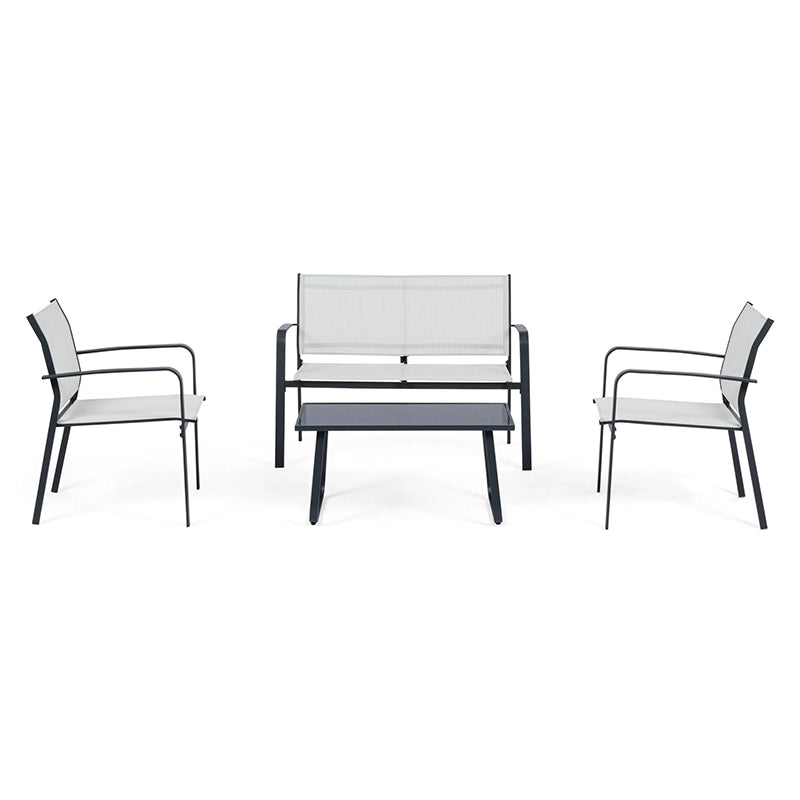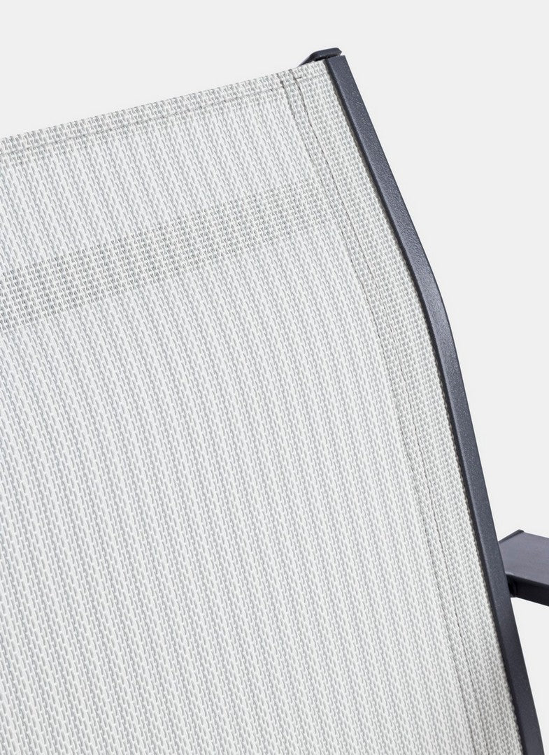 La struttura in acciaio antracite garantisce stabilità e durevolezza, rendendo il set adatto alle sfide delle condizioni esterne. Il tessuto in textilene bianco è noto per la sua resistenza e facilità di manutenzione, offrendo un comfort di seduta eccezionale e resistendo agli effetti del sole e delle intemperie.