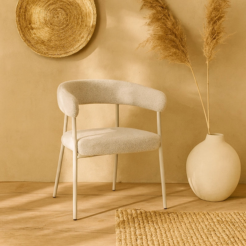 Le gambe in acciaio verniciato a polvere color tortora aggiungono stabilità e un aspetto moderno, perfettamente integrato con il rivestimento in bouclé. I braccioli sagomati migliorano ulteriormente il comfort, rendendo questa sedia ideale per il soggiorno, la sala da pranzo o l’ufficio.