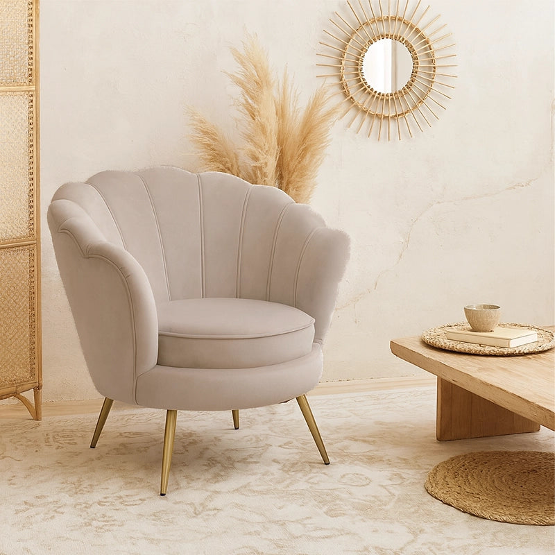 Design Sofisticato: La poltrona Giliola presenta un design sofisticato con gambe in acciaio oro e rivestimento in tessuto effetto velluto grigio chiaro, che conferiscono un aspetto lussuoso e moderno alla poltrona.