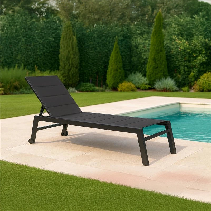 La seduta e lo schienale del lettino sono realizzati in textilene 2x1 con imbottitura, un tessuto traspirante, resistente e facile da pulire. Lo schienale è reclinabile in 5 posizioni per consentire il massimo comfort durante l'uso. Inoltre, il lettino è dotato di ruote in plastica per una facile movimentazione e la viteria è in acciaio galvanizzato per una maggiore resistenza.
