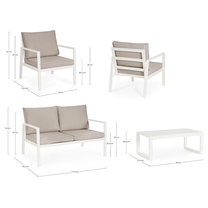 Il set è composto da due poltrone, un divano e un tavolino basso, creando una composizione lounge perfetta per momenti di relax, conversazione o aperitivi all’aperto. Le proporzioni equilibrate e il contrasto tra la struttura bianca e i cuscini beige donano all’insieme un’estetica contemporanea, facilmente abbinabile ad ambienti outdoor moderni o mediterranei.