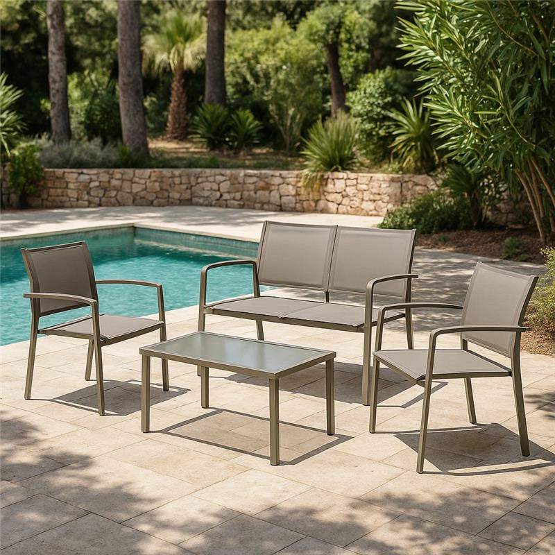 La struttura in acciaio garantisce solidità e stabilità, garantendo che il set possa affrontare le sfide delle condizioni esterne. Il tessuto textilene di colore tortora è noto per la sua resistenza agli agenti atmosferici e la sua facilità di manutenzione, offrendo un comfort di seduta eccezionale e resistendo agli effetti del sole e delle intemperie.
