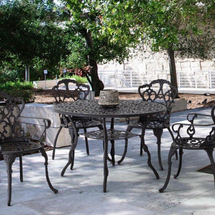 Il design barocco, arricchito da dettagli finemente lavorati, si adatta a diversi contesti: da giardini eleganti a terrazzi moderni. Grazie alla sua struttura in alluminio resistente, il tavolo è ideale per l’uso esterno e si mantiene in perfette condizioni nel tempo.