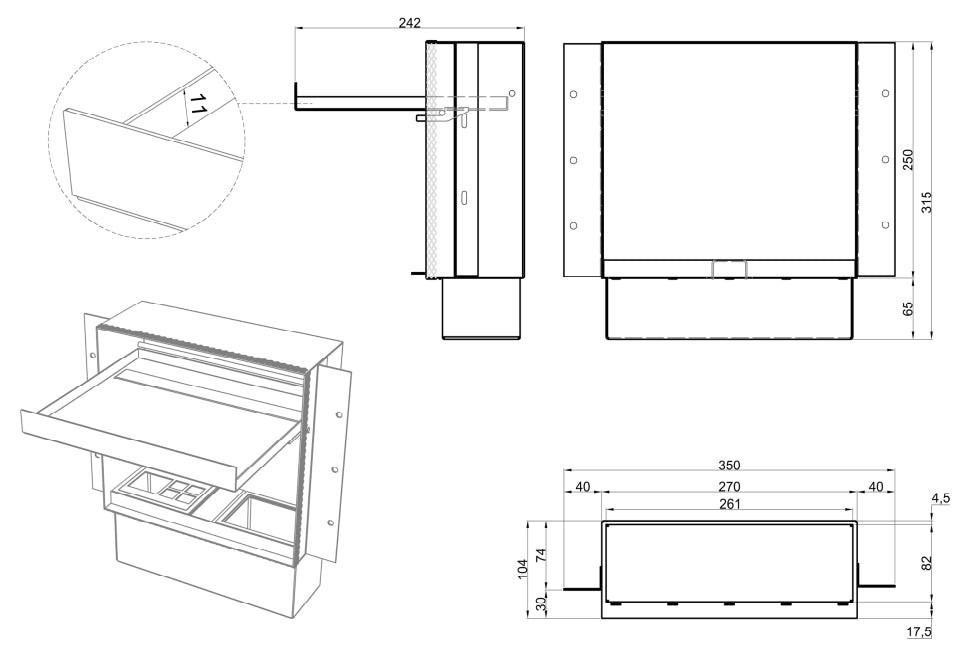 Ha la particolarità di avere due scomparti divisi per contenere in maniera ordinata e separata differenti articoli. Il design essenziale e pulito lo rende un'ottima scelta per un arredamento minimalista e moderno.