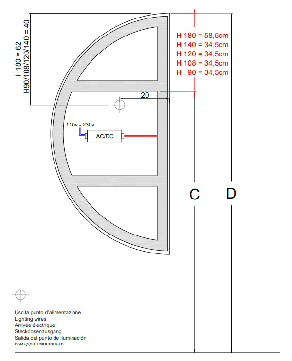 Ha un diametro di 180 cm e viene fornito con una illuminazione a LED bianca integrata che crea un'atmosfera rilassante e luminosa. Reversibile destra o a sinistra con spessore 5 mm con telaio.