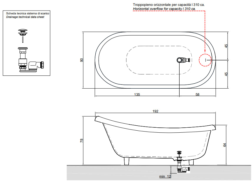 Con dimensioni di 192 x 90 cm, la Suite310 è perfetta per essere posizionata al centro della stanza, offrendo ampio spazio per un’esperienza di bagno confortevole. La vasca pesa circa 80 kg e ha una capacità di 310 litri, ideale per un’immersione completa e rilassante. È dotata di troppopieno, piletta con sistema di scarico click-clack, sifone e tubo flessibile, per garantire un utilizzo pratico e funzionale.