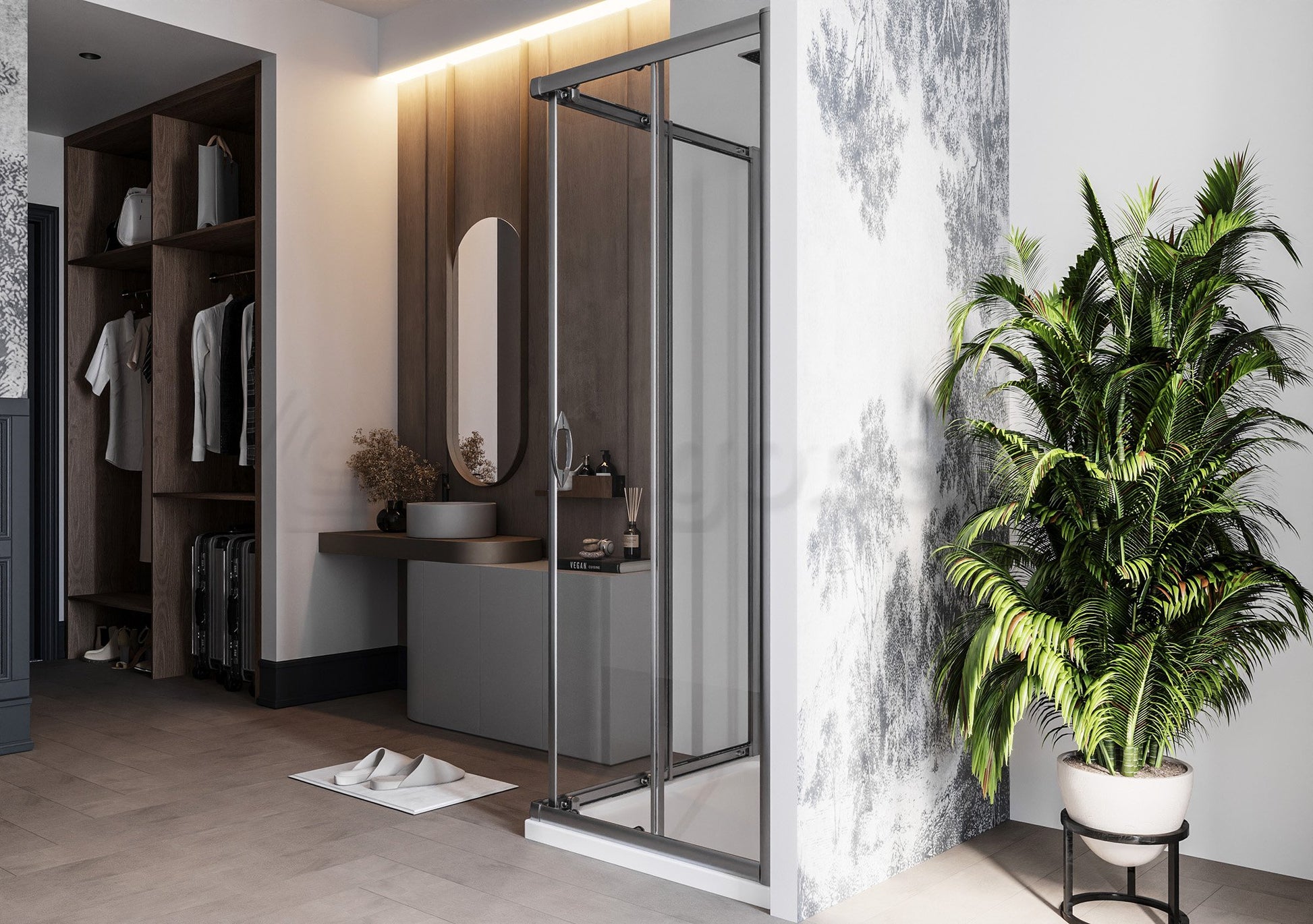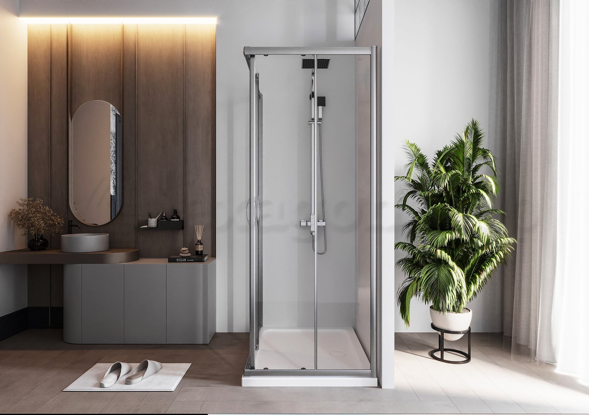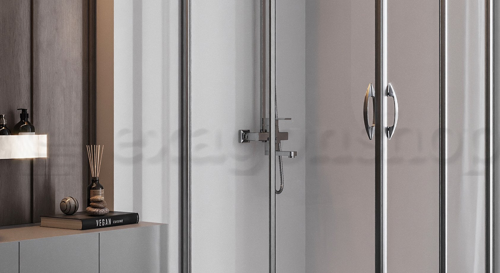 Genio è un elegante box doccia 70x100 angolare con due ante scorrevoli, progettato per una facile installazione e dotato di profili cromati dalla linea morbida.