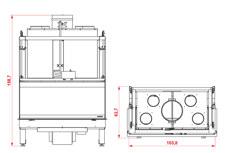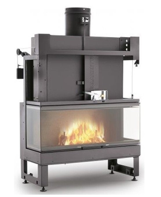 La struttura del focolare è realizzata in Thermofix®, un materiale refrattario che ottimizza l’accumulo e il rilascio del calore, garantendo un riscaldamento per irraggiamento uniforme e prolungato. Il caminetto presenta una porta sali-scendi con un sistema di scorrimento fluido per un’apertura semplice e sicura, mentre i vetri laterali sono apribili a battente per agevolare le operazioni di pulizia.