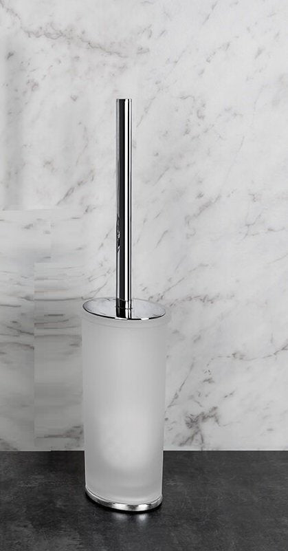 Materiali di Alta Qualità: La struttura del porta scopino è realizzata in cromo, noto per la sua resistenza alla corrosione, mentre il contenitore è in vetro acidato naturale, che conferisce un tocco di eleganza.
