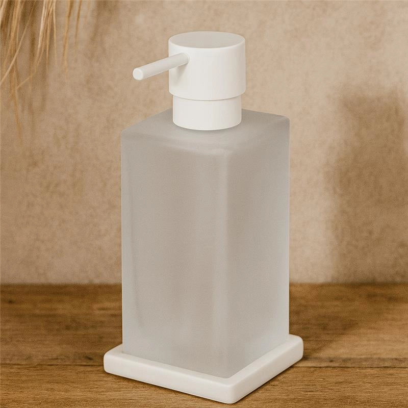 Materiale di Alta Qualità: Realizzato in vetro acidato bianco opaco di alta qualità, questo dispenser è resistente e adatto all'ambiente umido del bagno.