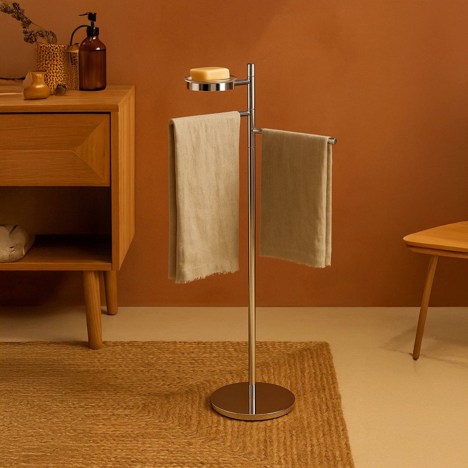 Design Multifunzionale: La piantana è dotata di due supporti per salviette e un portasapone integrato, offrendo soluzioni di archiviazione multiple in un unico elemento.