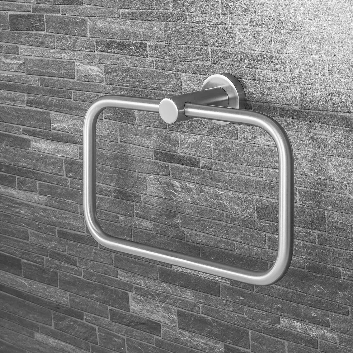 La sua forma ad anello con dimensioni di 21x15 cm consente di appendere comodamente gli asciugamani, mantenendoli sempre a portata di mano. Il colore cromo gli conferisce un design moderno ed elegante che si integra perfettamente in qualsiasi tipo di arredamento.