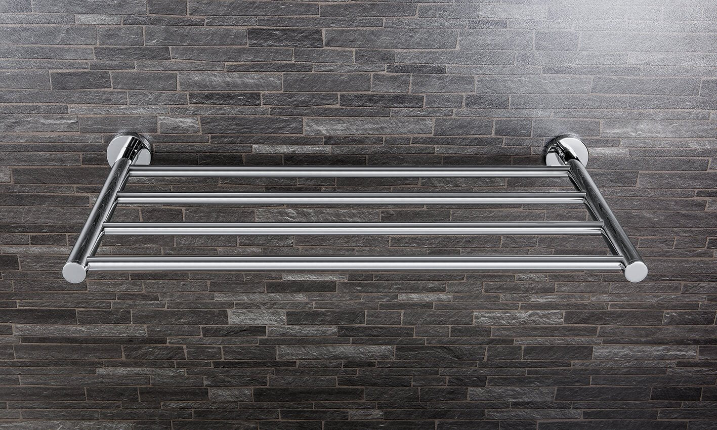 Il design a rack con quattro posizioni permette di appendere più asciugamani contemporaneamente, liberando lo spazio a parete. La sua lunghezza di 49,5 cm lo rende perfetto per posizionarlo vicino alla doccia o alla vasca da bagno. Il colore cromo gli conferisce un design moderno ed elegante che si integra perfettamente in qualsiasi tipo di arredamento.