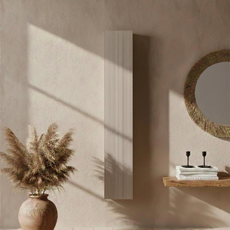 L’anta cannettata conferisce al mobile un effetto tridimensionale, che aggiunge profondità e movimento alle superfici. La finitura in teak, ispirata al legno naturale, dona calore e un tocco di eleganza rustica e contemporanea, perfetta per ambienti che uniscono modernità e materiali naturali. Il teak è una scelta classica che si adatta a vari stili di arredamento, dal moderno al tradizionale.