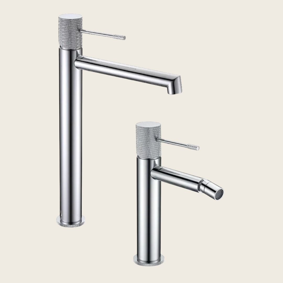 La coppia di rubinetti miscelatore per lavabo alto e bidet, senza scarico, in ottone cromo della serie Melin, unisce design elegante e funzionalità affidabile per il tuo bagno.