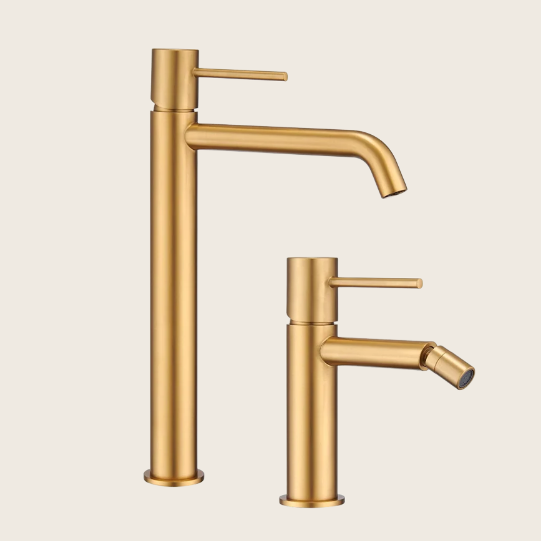 La coppia di rubinetti miscelatore per lavabo alto e bidet, senza scarico, in ottone oro spazzolato della serie Memo, unisce stile sofisticato e funzionalità affidabile per il tuo bagno.