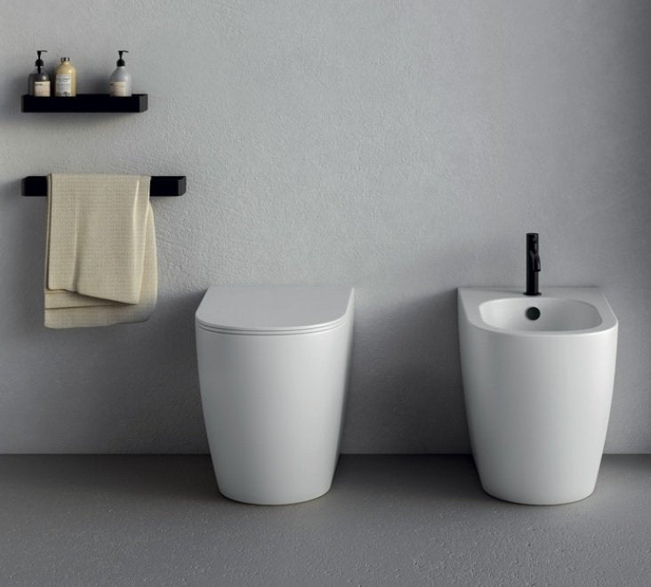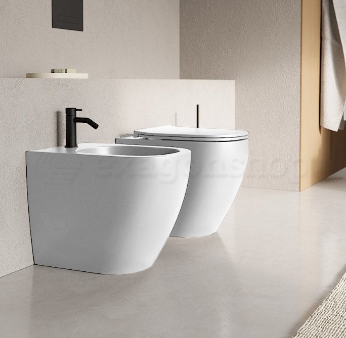 Coppia sanitari a terra bidet e wc senza brida scarico a parete con sedile soft close termoindurente bianco lucido Pin Nic Design