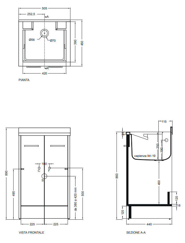 Fornito di vasca lavapanni in ABS metacrilato lucido, tavola di lavaggio in legno massello, sifone e troppo pieno.