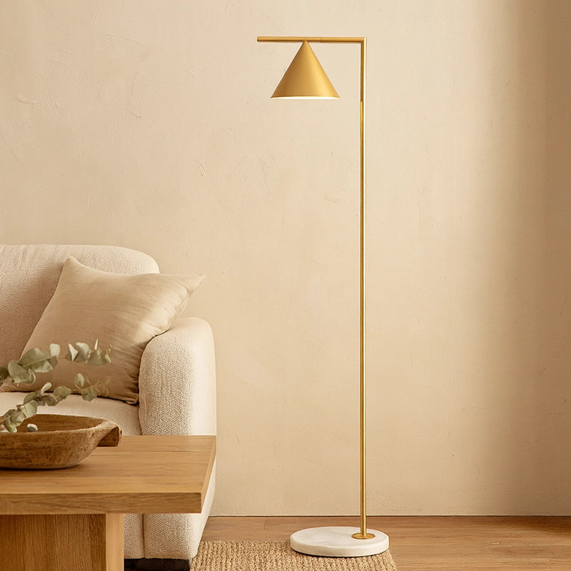 La lampada è realizzata in ottone spazzolato, che le conferisce un aspetto raffinato e di alta qualità. L'asta e il cono in acciaio verniciato sono di colore ottone e la base in marmo bianco, mentre il diffusore in policarbonato opalino fotoinciso stampato ad iniezione assicura una luce morbida e diffusa.