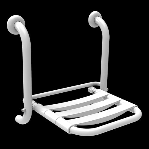 SEGGIOLINO DOCCIA RIBALTABILE FORMATO DA STRUTTURA REALIZZATA IN ACCIAIO INOX AISI304 Ã32 MM,RIVESTITA CON MATERIALE ANTIUSURA EPOSSIPOLIESTERE, CON PROPRIETÃ ANTIBATTERICHE DEI SALI D'ARGENTO BIO-GOMAN CON SISTEMA A FRIZIONE PER BLOCCAGGIO IN POSIZIONE VERTICALE, SEDUTA IN DOGHE IN PPL, COMPLETO DI: VITE SVASATA DI UNIONE Ã MM 10, PIATTELLI PER FISSAGGIO A PARETE IN ACCIAIO INOX, A 6 FORI, ROSONI ACCIAIO INOX FUNZIONE "ANTIVANDALO". CE DISPOSITIVO MEDICALE, GARANZIA 10 ANNI. CAPACITÃ DI CARICO 150 KG. COLORE BIANCO RAL 9016. DIMENSIONI MM 475(L) X 400(P) X 352(H). TIPO: GOMAN ARTICOLO X812/01