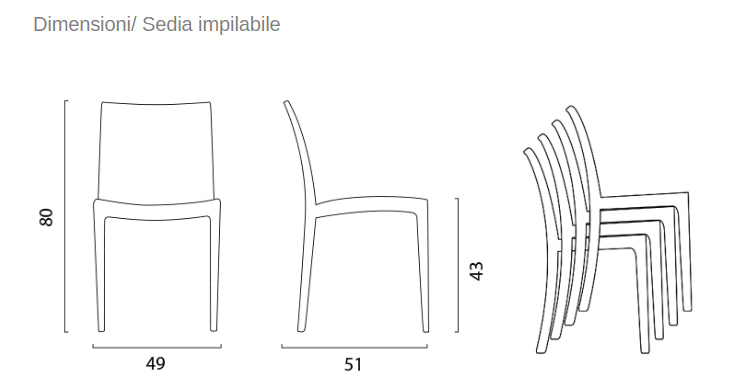 Con dimensioni di 80x49x51 cm, la sedia Trieste si adatta facilmente a diversi ambienti. La sua struttura impilabile consente di risparmiare spazio quando non in uso, semplificando la gestione e lo stoccaggio.