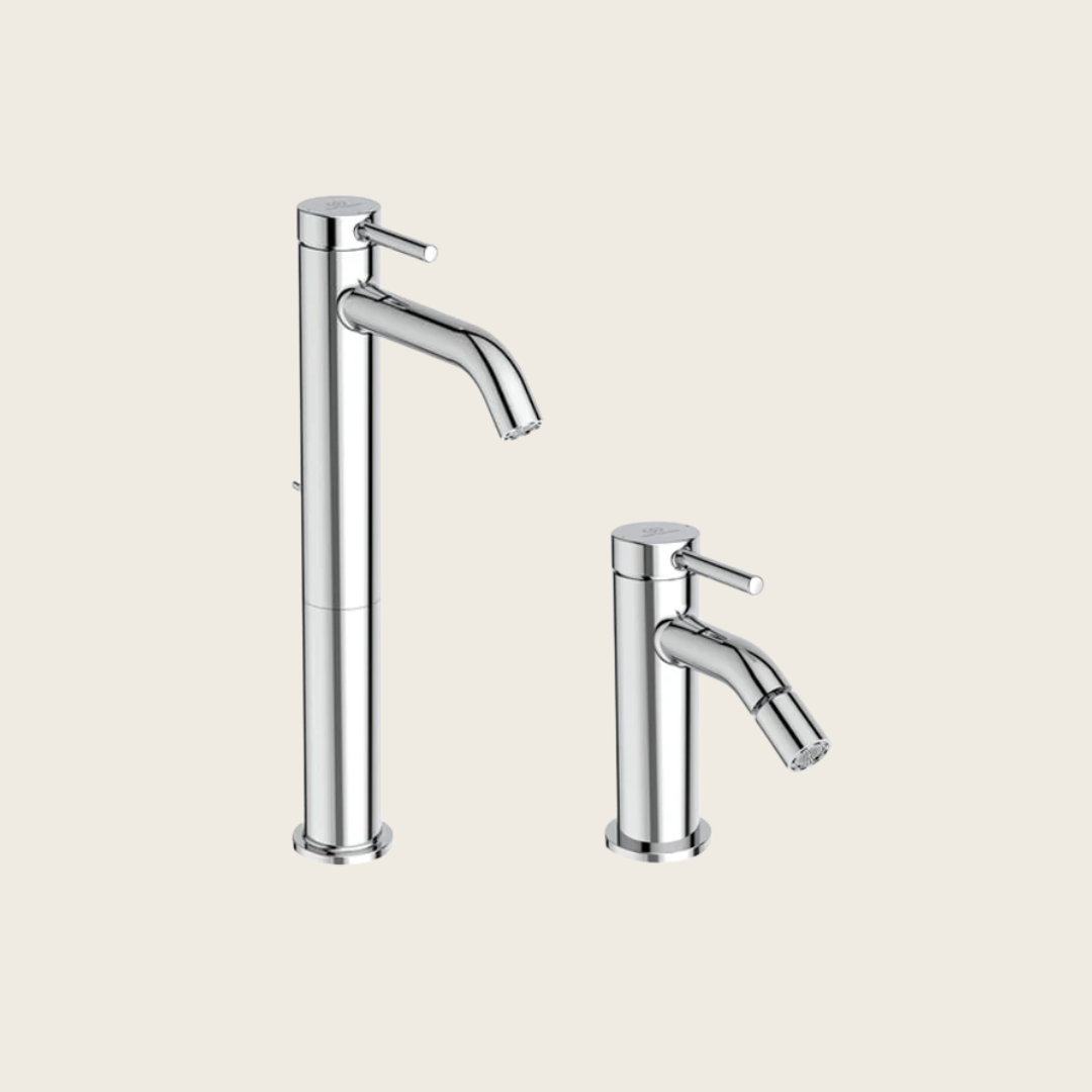 La coppia di miscelatori monocomando alto per lavabo con asta comando e bidet con scarico click clack di Ceraline Ideal Standard rappresenta un'aggiunta elegante e funzionale al tuo bagno, garantendo un design moderno e prestazioni affidabili.