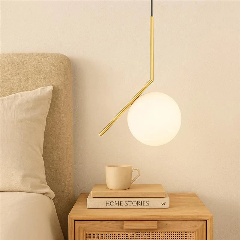 Il diffusore sferico in vetro soffiato opalino è il fulcro del design, emanando una luce morbida e uniforme che crea un'atmosfera accogliente e raffinata in qualsiasi ambiente. Il vetro soffiato opalino non solo diffonde la luce in modo omogeneo, ma aggiunge anche un tocco di lusso grazie alla sua finitura satinata e alla lavorazione artigianale.