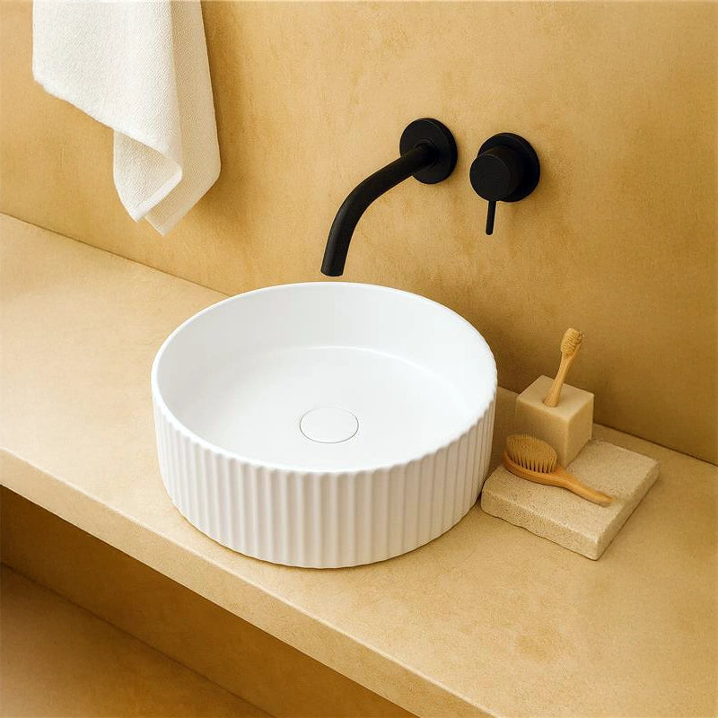 Il design tondo del lavabo contribuisce a creare una sensazione di armonia e semplicità, mentre le sue dimensioni compatte lo rendono adatto anche per bagni con spazio limitato. Questo lavabo da appoggio è ideale per chi cerca un elemento di design elegante e pratico, che si integra perfettamente con una varietà di stili di arredamento del bagno.