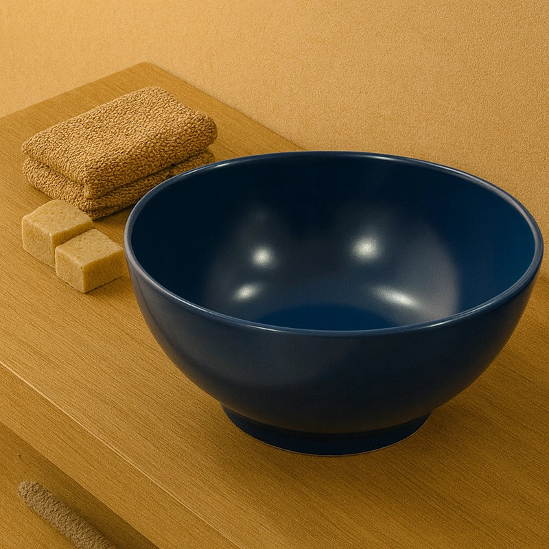 Il design a ciotola tonda del lavabo offre una forma semplice e fluida, che si adatta facilmente a diversi stili di arredamento. La finitura matt in color indaco conferisce un aspetto sofisticato e contemporaneo, mantenendo al contempo una superficie opaca che riduce le impronte e le macchie, facilitando la manutenzione e la pulizia.