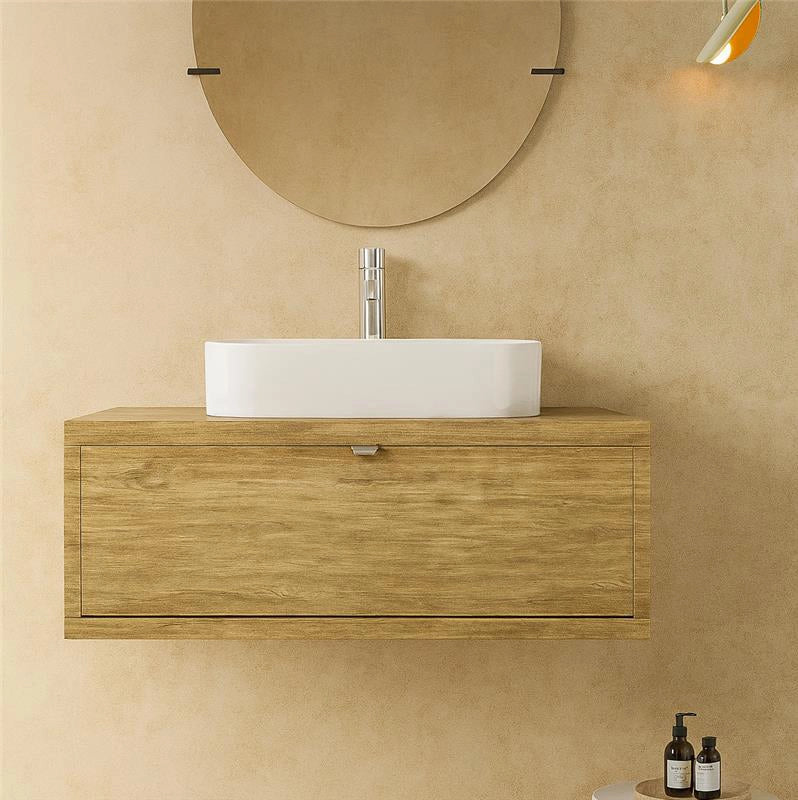 Il mobile bagno sospeso Thema in Rovere Farnia, con dimensioni 110x50 cm, è una soluzione elegante e funzionale per arredare il bagno in modo moderno e pratico. Dotato di un ampio cassettone con estrazione totale e chiusura ammortizzata, il mobile include anche un raffinato lavabo rettangolare da appoggio in ceramica bianca, ideale per chi desidera un design minimalista e funzionale.