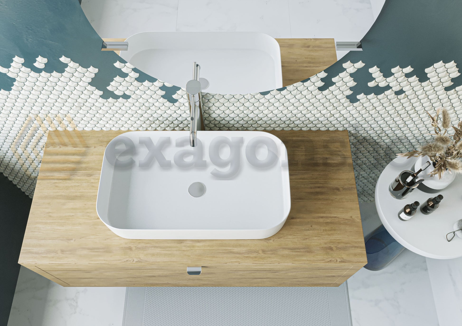 Il mobile è fornito con un lavabo rettangolare da appoggio in ceramica bianca, elegante e minimalista. La ceramica è un materiale durevole, facile da pulire e resistente a graffi e macchie. Il lavabo, senza troppo pieno, offre un aspetto moderno e pulito, perfetto per completare l’estetica contemporanea del mobile. La forma rettangolare si adatta perfettamente allo stile geometrico e lineare del mobile.