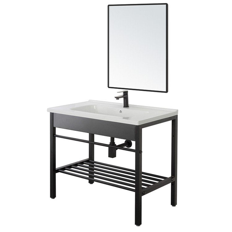 Mobile bagno nero 80x47 Borg a pavimento con lavabo struttura in metallo e specchio
