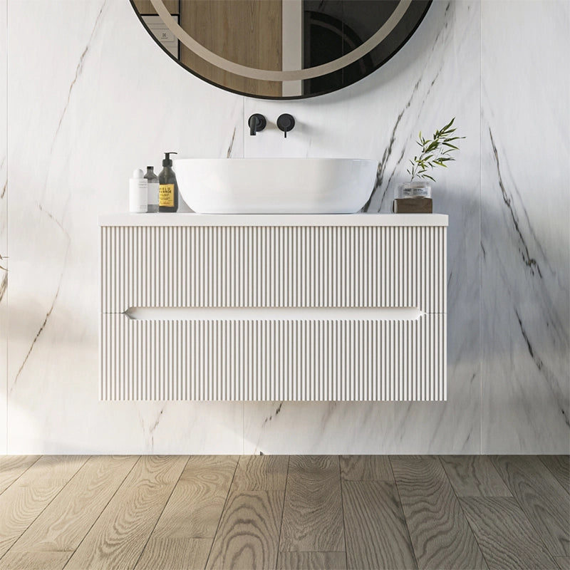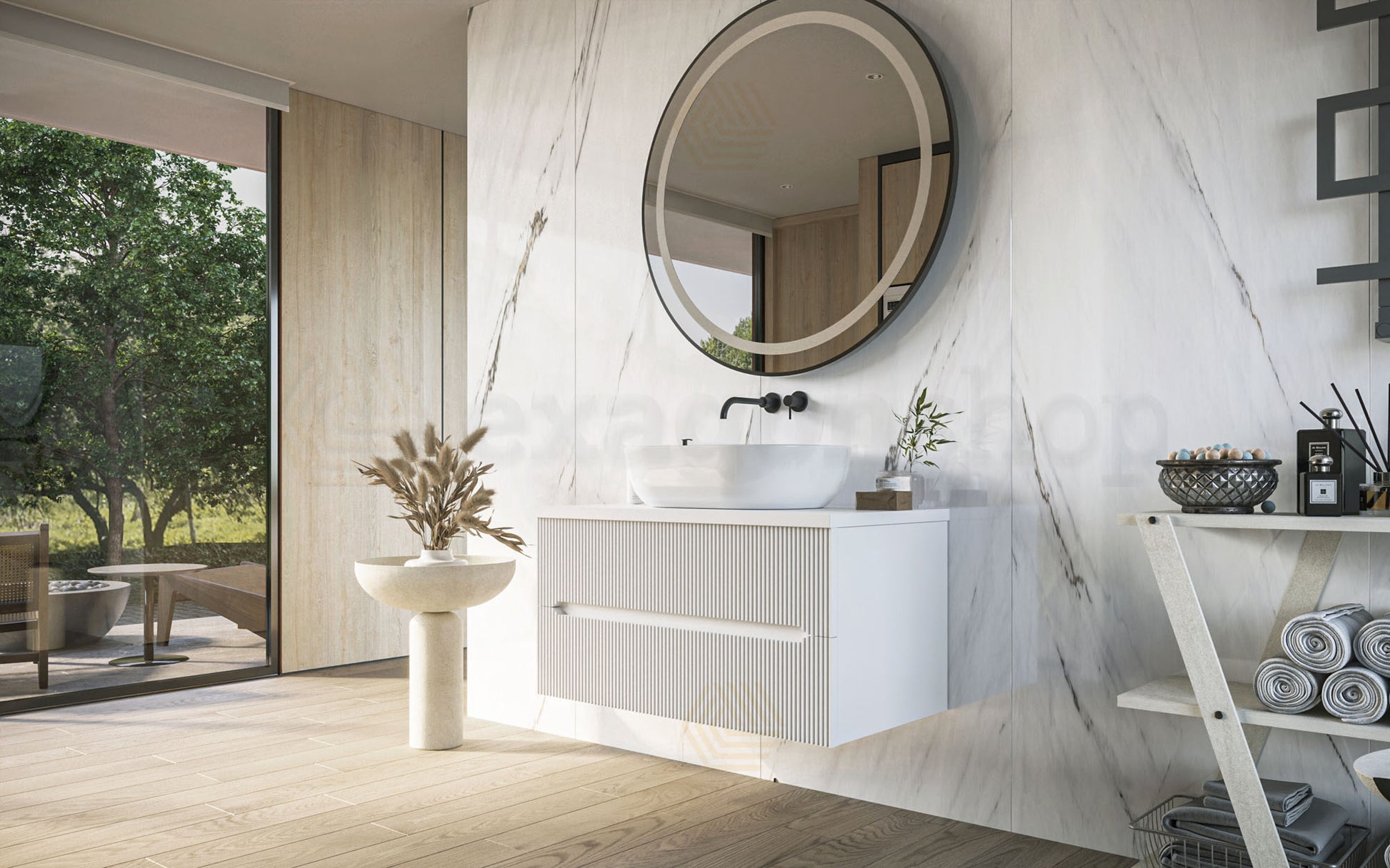 Mobile bagno bianco opaco 70x46 cannettati Urbino con ciotola da appoggio quadra in ceramica e due cassetti