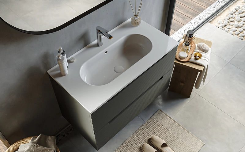 Il mobile bagno sospeso Mango completo di lavabo in ceramica è caratterizzato da un frontale con caratteristici canali solcati, maniglie incassate, finiture opache e due capienti cassetti ad estrazione totale e chiusura rallentata.