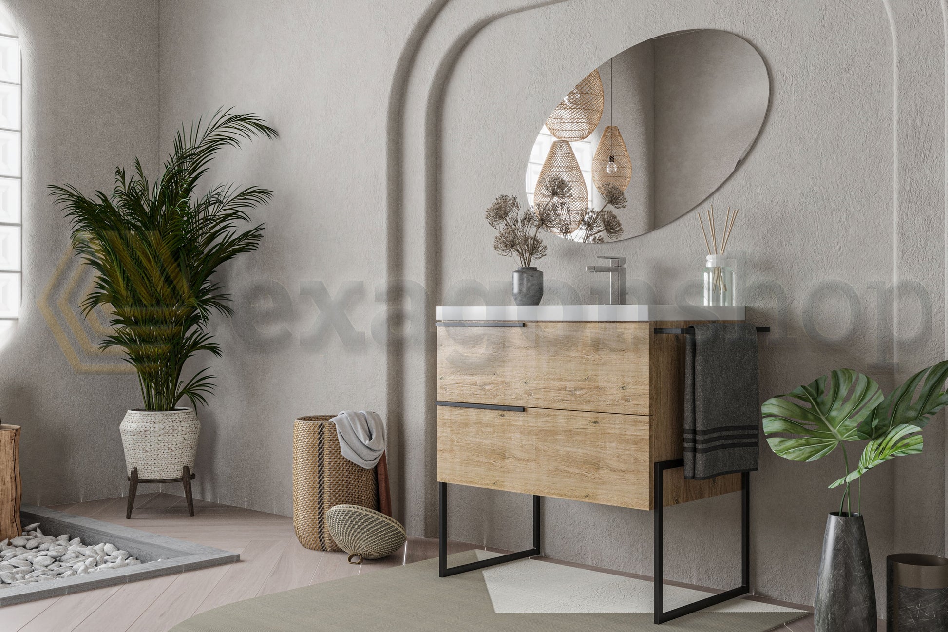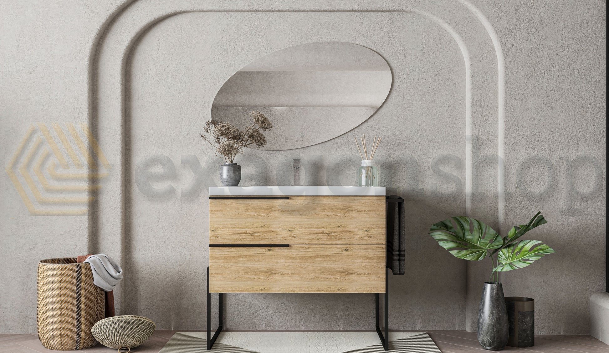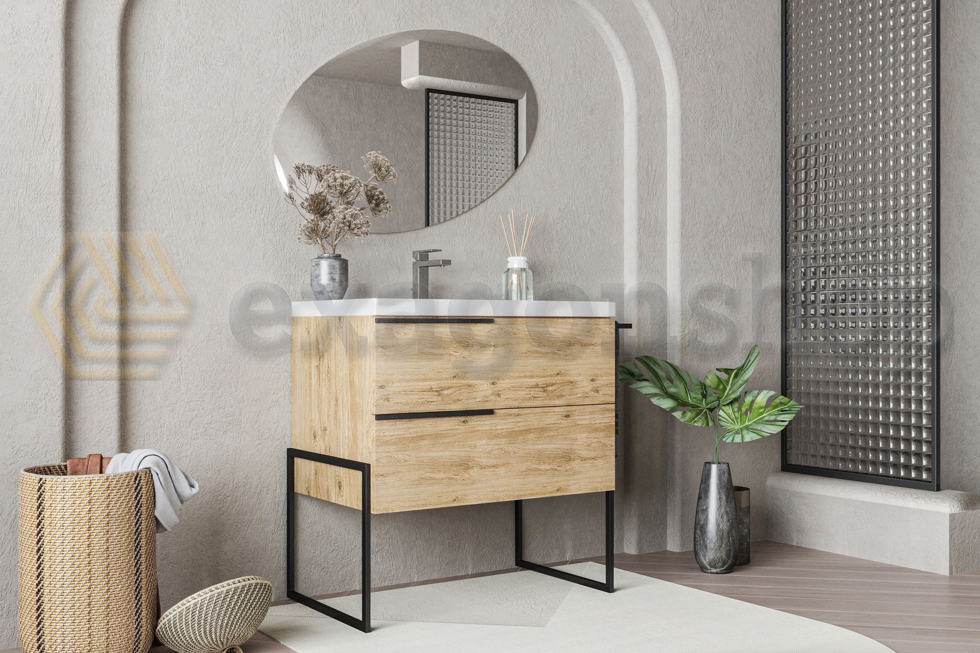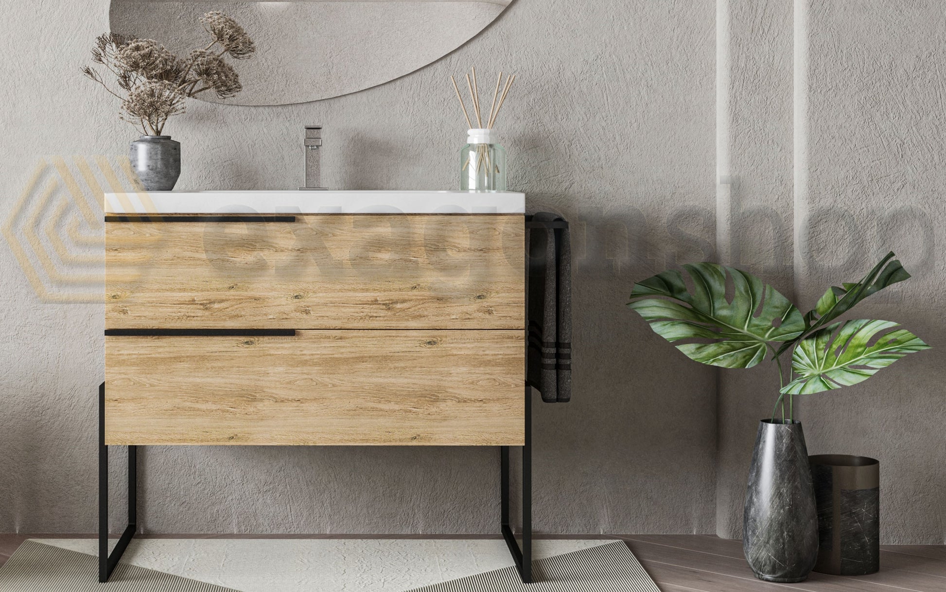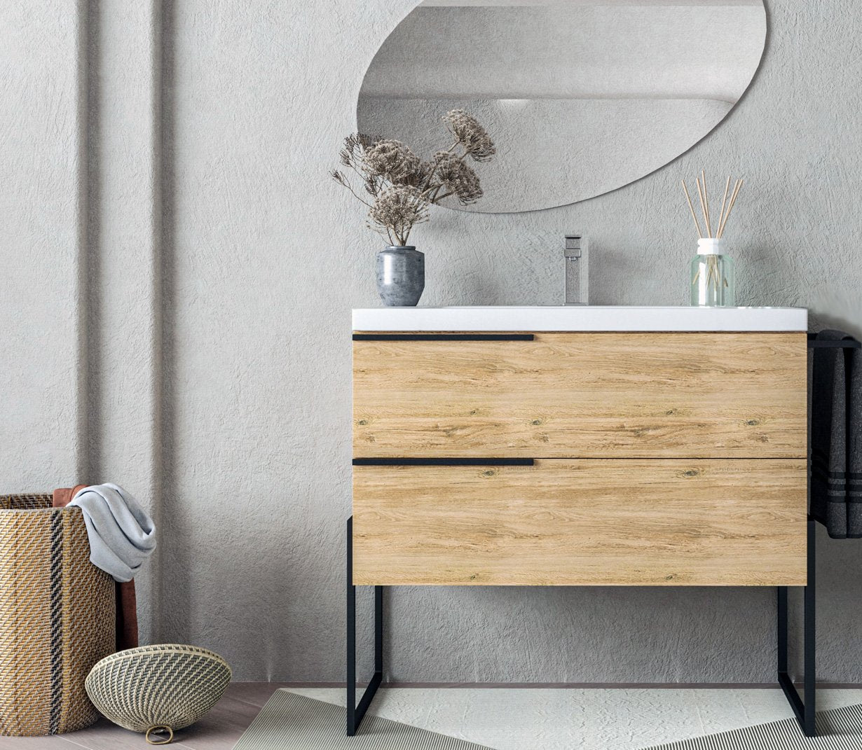 Il mobile bagno a pavimento Venezia in quercia naturale, con dimensioni 100x45 cm, è un perfetto equilibrio tra tradizione e modernità. Questo mobile, dotato di due cassetti capienti, lavabo integrato, e portasciugamani in metallo nero opaco, si distingue per il suo design minimalista e per i dettagli raffinati come i piedi e le maniglie in metallo nero opaco. La speciale finitura in quercia naturale aggiunge calore e un tocco naturale, creando un ambiente bagno rilassante e accogliente.