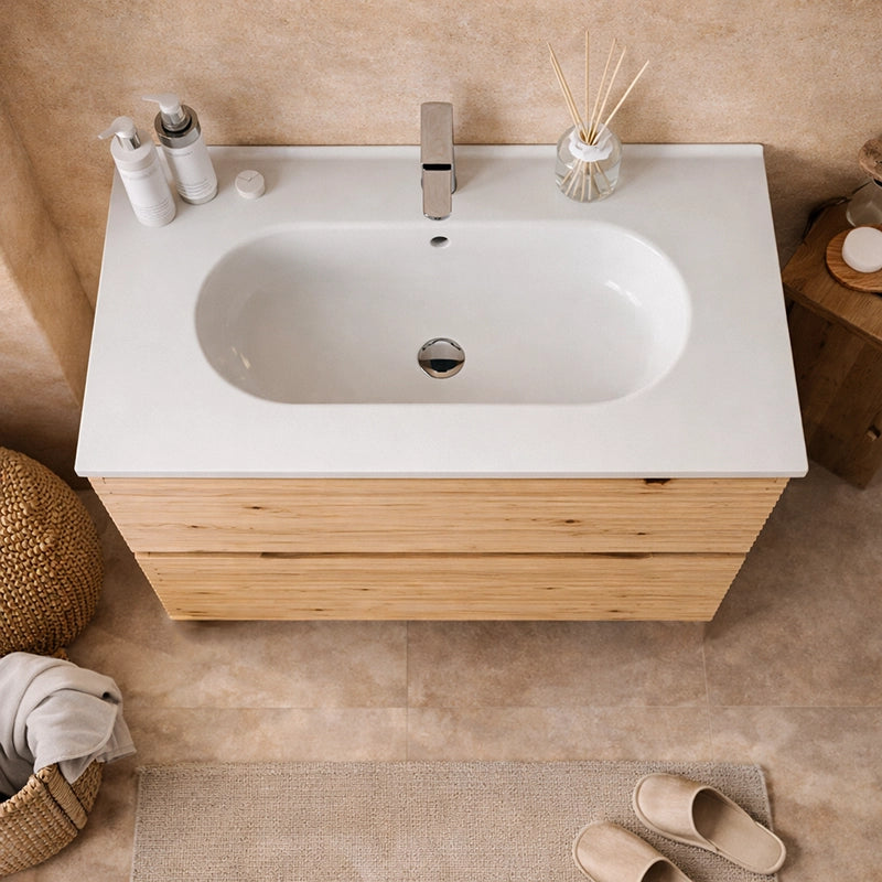 Il frontale del mobile presenta caratteristici canali solcati che aggiungono un tocco di originalità e stile all'ambiente bagno. Le maniglie sono incassate nel frontale, garantendo una linea pulita e senza sporgenze. Le finiture effetto legno conferiscono calore all'ambiente e si adatta perfettamente agli stili di arredamento moderni.
