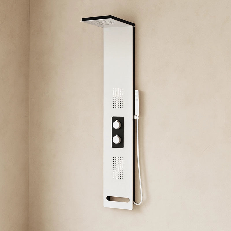Realizzato in alluminio di alta qualità, il pannello doccia è resistente e duraturo nel tempo. Disponibile in colore nero o bianco, il design moderno e pulito del pannello si adatta perfettamente a qualsiasi tipo di bagno, conferendo un tocco di eleganza e raffinatezza.